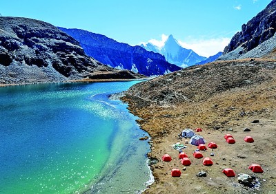 在四川稻城亚丁景区,徒步爱好者在湖边搭建帐篷。新华社发