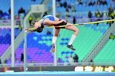 11月19日,十五运会田径项目女子跳高决赛在广州举行,湖北队选手邵雨琪夺得冠军。本报记者 陈城摄/光明图片
