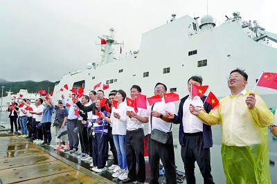 当地华侨华人冒雨迎接中国海军编队。