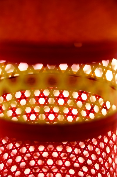 ??尤值一提的是,该套竹编家具所展现出的十足“摩登”感,不仅有赖于造型的巧妙设计,还离不开色彩的精心营造。作品采用毛竹与橡木作为基础材料,为了与竹编的淡雅色泽形成对比,设计师大胆借鉴曾风行于意大利的孟菲斯派色彩风格,采用高饱和度的红、黄、蓝、紫等颜色装饰构件,打破了竹、木材料固有的沉静气质,使作品呈现出鲜艳灵动的视觉效果。如在“平行竹编吊灯”中,各色竹篮形灯罩呈层叠排列,以重色边框进行分割,灯罩之下是包裹光源的原色竹编筒。白天,当阳光穿透悬挂于窗边的吊灯时,斑斓的光影会在墙面与地面上编织出抽象的几何图案;夜晚,当灯光亮起,鲜艳的色彩仿佛被一一点燃,大红、明黄、宝蓝、绛紫在光照下愈发通透,而原色竹编筒滤出的柔和光晕,则为室内添上了一抹温润的底色。
