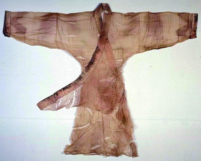 ??这件衣服为何叫素纱单衣?其准确的名称应是“素纱襌衣”。所谓襌衣,就是没有衬里的衣服。素纱属于高档衣料,在周朝时多用作上层贵族袍服的衣里料。素纱单衣的衣料为没有染色的平纹方孔丝织物素纱。经测算,其用纱料约2.6平方米,若除去衣领、衣袖、衣襟边缘的绢,主体部分重量仅20余克,可谓“薄如烟雾,轻若无物”。