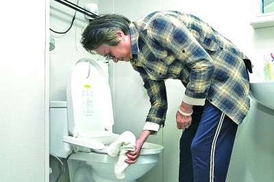 上海杨浦区定海路街道居民在擦拭抽水马桶。新华社发