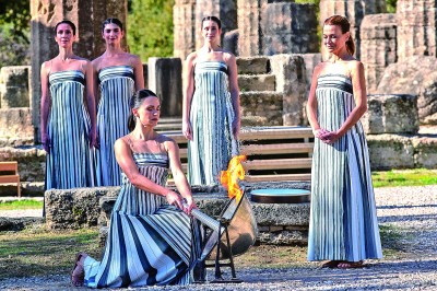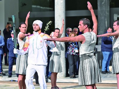 作者: 《光明日报》( 2025年11月27日 12版) 11月24日,扮演最高女祭司的演员玛丽·米娜在彩排仪式上取火。新华社发 第一棒火炬手、希腊运动员彼得罗斯(前左)传递火炬。 新华社发
