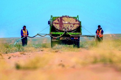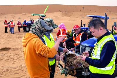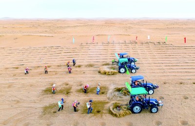 治沙队员跟随打坑机,将耐干旱抗风沙的花棒种植在草方格中。