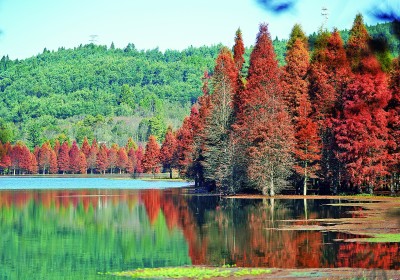 ??近日,云南省昆明市西山区三家村水库水杉树木色彩依旧斑斓。