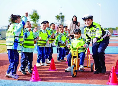 ??在“全国交通安全日”来临之际,各地开展交通安全进校园活动,为同学们普及交通安全知识,培养交通安全意识。图为12月1日,在江苏省兴化市施耐庵幼儿园,兴化市公安局交警和小朋友们进行交通安全情景模拟游戏互动。新华社发