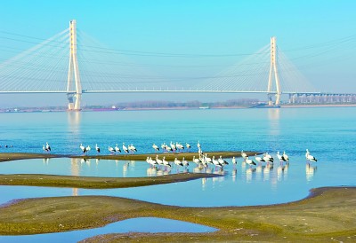 ??长江安徽省池州市贵池段,拥有众多鱼虾丰富的浅水区域,是长江中下游候鸟迁徙的重要节点,吸引了包括东方白鹳、小天鹅、豆雁在内的十多种候鸟来此越冬。图为日前,在贵池段的天然沙洲上,国家一级保护动物东方白鹳在栖息、觅食。饶治国摄/光明图片