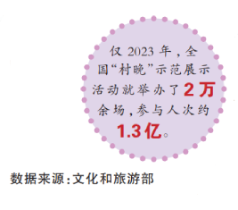 ??作为村民自编、自导、自演的乡村文化活动,“村晚”从2023年起常态化开展,以春、夏、秋、冬四季为周期为乡村群众搭建起常态化展示自我的舞台。文化和旅游部数据显示,仅2023年,全国“村晚”示范展示活动就举办了2万余场,参与人次约1.3亿。