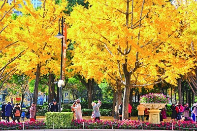 ??12月3日,秋冬时节,上海音乐厅南广场银杏树叶已染上金黄,成为热门赏景地,吸引市民前来拍照打卡。
