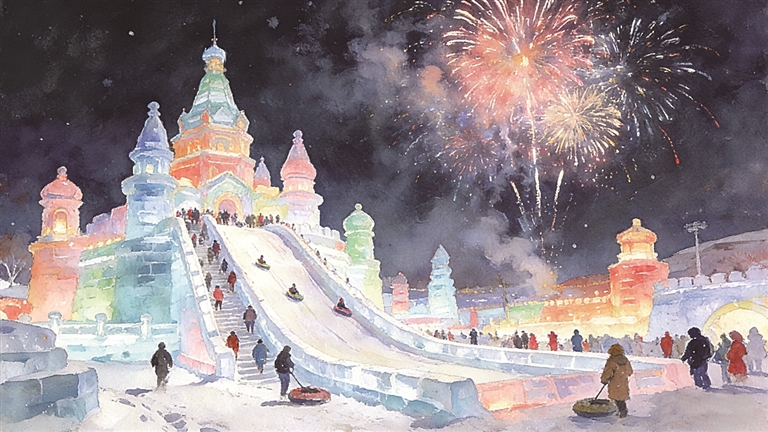 跨年当天下午,一家人早早便来到冰雪大世界景区。高耸的摩天轮、巨大的冰滑梯,以及各式精美的冰雕建筑看得人眼花缭乱,仿佛将我们拉进了童话的世界,就连我这个中年人也忍不住在雪地里蹦跶起来。游玩过程中天色渐暗,冰雕里的彩灯逐一亮了起来,粉红、粉蓝、粉绿,温柔的色彩晕染在澄澈的冰面上,美极了。正当我们在冰滑梯的等候队伍中缓缓前行时,天空中传来一声巨响,原来是烟花秀开始了。整个冰雪大世界顿时流光溢彩,目之所及皆似梦幻。我们只顾得欣赏眼前美景,竟全然忘记了按下快门留念。于是,我决定用画笔将这一刻记录下来。