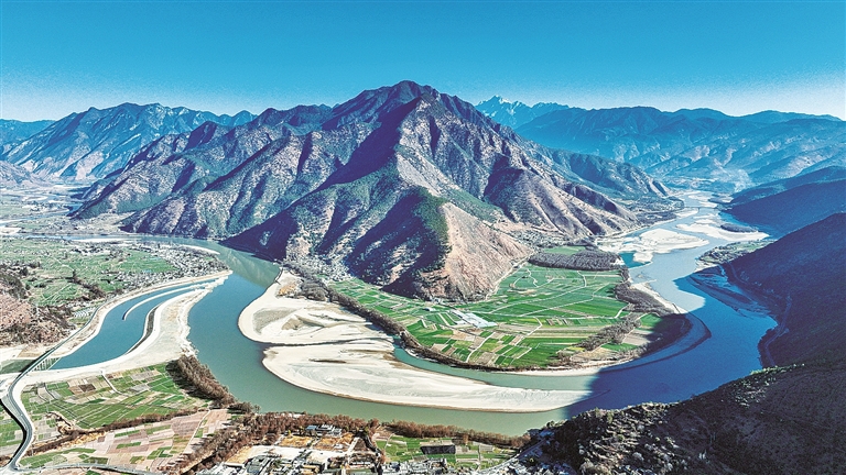 1月20日,云南玉龙石鼓镇的长江第一湾,清澈的江水与农田、村庄及远处的雪山相映成趣,构成一幅美丽的生态画卷。张洪科摄/光明图片