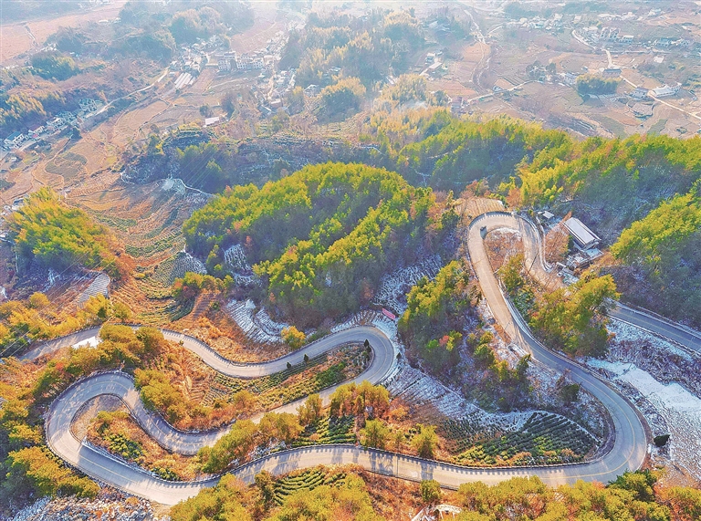 1月22日,安徽岳西县莲云乡莲塘村,公路蜿蜒穿梭在田园民居、山峦植被间,串联起生态旅游、特色农业等各个环节。吴均奇摄/光明图片