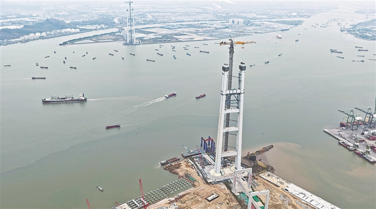 1月22日,粤港澳大湾区核心枢纽工程——狮子洋通道狮子洋大桥主塔高度突破300米,预计将于今年4月前后封顶。狮子洋通道连接广州市南沙区和东莞市虎门镇,全长约35公里。图为当日拍摄的狮子洋通道狮子洋大桥东塔及远处的西塔。新华社记者邓华摄