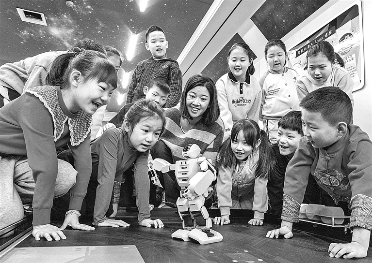 寒假期间,许多中小学生走进内蒙古呼和浩特市玉泉区青少年宫,在探索与实践中培养对科学技术的兴趣和爱好,丰富假期生活。图为1月22日,孩子们与智能机器人开心互动。丁根厚摄/光明图片