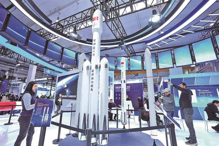 1月23日,以“汇聚全球资源 共促商业航天”为主题的2026北京国际商业航天展览会开幕,本次展会展出面积约2万平方米,展出内容覆盖火箭与运载系统、卫星制造、航天应用、航天服务与配套等领域。图为观众参观展出的火箭模型。新华社记者 鞠焕宗摄