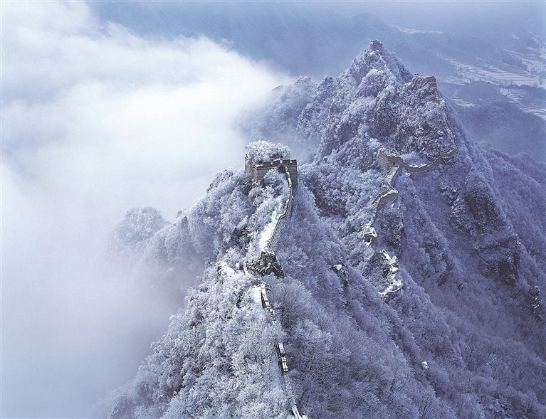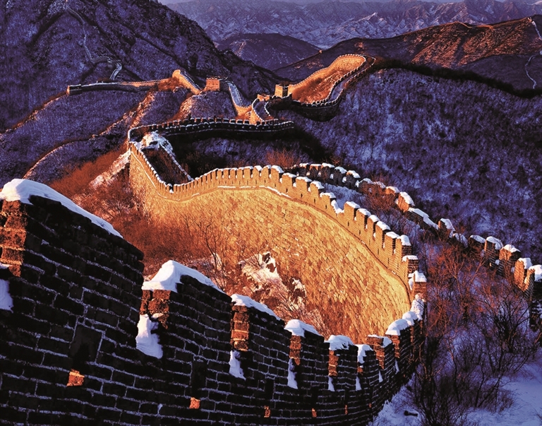 当暖色的阳光照射到墙体上,长城会被映照成金黄色;当皑皑白雪覆盖群山,长城宛若一条银龙匍匐其间……