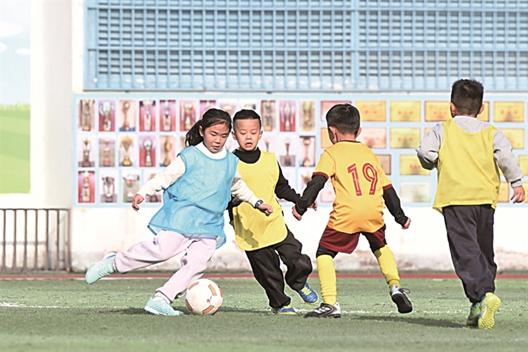 寒假期间,在贵州省仁怀市,许多热爱足球运动的学生来到足球场,在教练的带领下学习足球知识、进行技能训练。图为1月26日,孩子们在进行足球训练。陈勇摄/光明图片