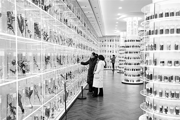 近年来,宁夏固原市隆德县立足六盘山道地中药材资源禀赋,持续推动中药材规模化生产,打造中医药科普体验馆、六盘山药用植物科普教育基地和中医康养特色街区。图为1月26日,游客在隆德县中医药科普体验馆内参观。新华社记者 杨植森摄