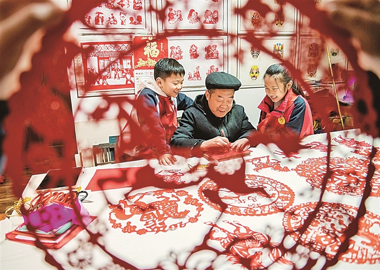 1月30日,安徽省含山县新时代文明实践中心组织孩子们走进市级非遗传承人洪诗成工作室,开展寒假马年非遗剪纸体验活动。孩子们跟随传承人学习折、剪、刻等剪纸技艺,感受传统工艺的独特魅力。图为非遗传承人洪诗成教孩子们学习马年剪纸。欧宗涛摄/光明图片