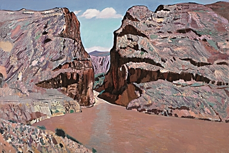 在语言探索方面,中国写意油画亦呈现出多种路径与丰富面貌。闫平的《去大海 去天边》(图③)将西方现代主义手法与中国的写意精神相融合,浓郁的色彩与跃动的笔触形成了一种视觉上的韵律感,展现出表现性油画语言的独特魅力。王克举的《正午野狐峡》(图⑧)通过强烈对比的色块和简化的造型,将自然景观提炼为具有节奏感的视觉结构,实现了对客观物象的主观重构。马路的《金木水火土》系列作品则以中国传统五行观念为灵感,将哲学思考转化为视觉语言,在具象与抽象之间探索新的表达可能。段正渠的《靖边白城子》以厚重肌理和质朴色彩,刻画了黄土高原的地貌特征与人文气息,画面中斑驳的笔触仿若岁月在土地上留下的痕迹。诸多探索表明,写意油画的语言创新具有充分的开放性和包容性,容纳了艺术家们全然不同的个性化表达。