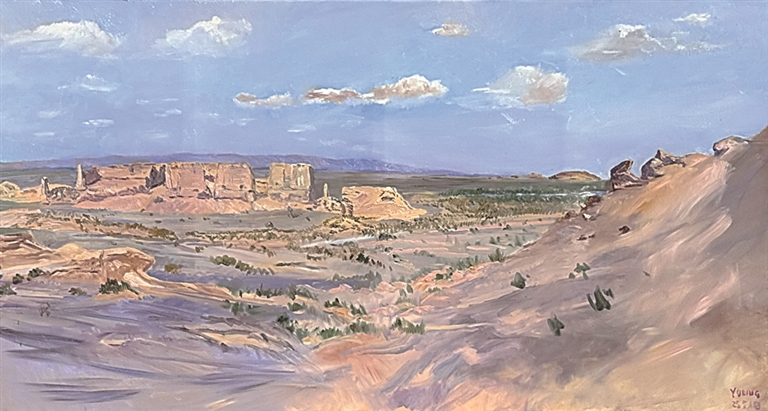 此外,写意油画还积极探索“虚”与“实”的意境营造,运用油彩的特性,借鉴中国画“计白当黑”的智慧,注重画面的留白、透气与虚实相生。王辉的《雾锁崇峰》(图②)以虚实变幻的手法处理山峦与雾气的关系,使画面在具象与抽象之间自由游走。笔者的《玉门关河仓城》(图④)则以苍茫色调和简洁构图,通过虚实对比唤起人们对丝绸之路的遥远记忆。这种意境营造,将观者的想象引向画外无限悠远的时空,实现了油画语言与中国传统美学的融合。