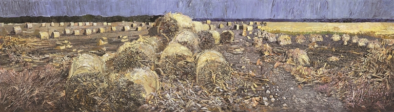 近年来,写意油画的创作实践植根于中国大地,成为对现实生活的艺术回应。艺术家们纷纷走出画室,深入祖国各地,在直面自然与生活的过程中激发创作灵感,将个体感受与时代精神相融合。张路江在福建东山创作的《木麻黄》(图⑥),以独特的视角捕捉南方海岸线的特质。画面里,于风中摇曳的木麻黄不仅是对自然物象的再现,更是坚韧生命力的象征,体现了艺术家对地域特征的深刻理解与人文关怀。王建国的《风拂大地》(图⑦)扎根于东北广袤的黑土地,流动的笔触和强烈的色彩表现出这片土地的丰饶与生机,抒发了画家对家国故土的深情厚谊。这些作品表明,写意油画的创新并非闭门造车,而是在与广阔大地和现实生活的对话中自然生发的。