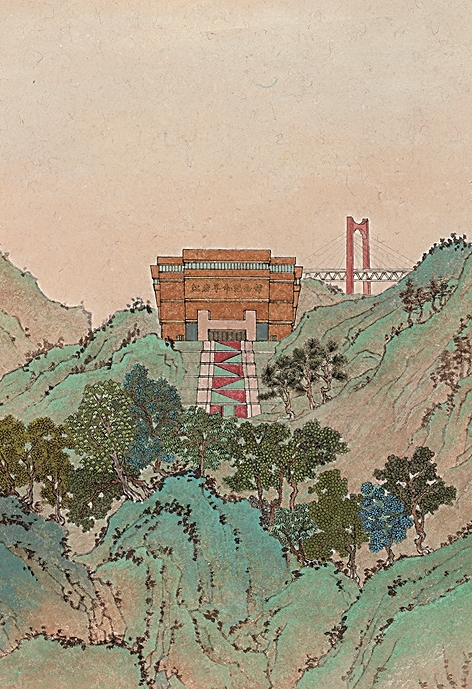 观展结束后,回望这座屹立于山峦间的建筑,我不禁心生感慨,它宛如一座不朽的丰碑,在时间的洗礼中岿然不动。我不自觉地在手中的速写本上画了起来。我将纪念馆置于画面中心,以凸显其庄严与神圣,山峦、树木如忠诚的卫士环绕四周,远处的红岩村大桥横跨天际,仿佛连接着过去与未来,象征着革命精神的代代传承。