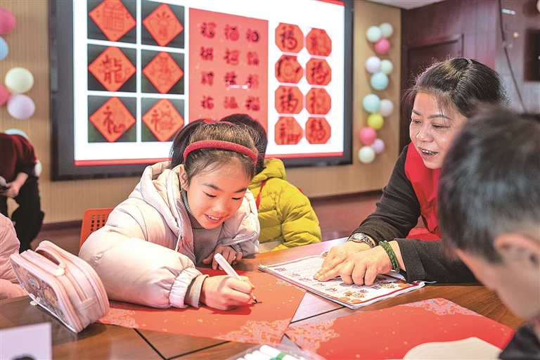 2月1日,由湖南省长沙市芙蓉区总工会、共青团长沙市芙蓉区委共同主办的“芙蓉朵朵”2026年寒假爱心托管班正式开班。本次爱心托管班针对快递员、外卖骑手、货车司机等劳动者的工作与生活特点,通过社区外卖站点等渠道摸排托管需求,精准对接,在辖区内共设置四个托管点位,免费提供为期10天的托管服务,为新职业群体子女搭建起安全、充实、温暖的假期成长平台。图为学生们在课堂上写福字。