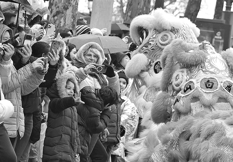 “欢乐春节满巴黎·龙狮贺岁舞香街”春节巡游活动2月1日在巴黎香榭丽舍大街举行,庆祝即将到来的农历春节。这是该活动第四次亮相香榭丽舍大街,由机器人引领的春节巡游表演方阵和紧随其后的舞龙舞狮、民族舞等传统表演,吸引了大街两侧的巴黎市民和游客驻足观看。图为人们观看巡游活动上的醒狮表演。