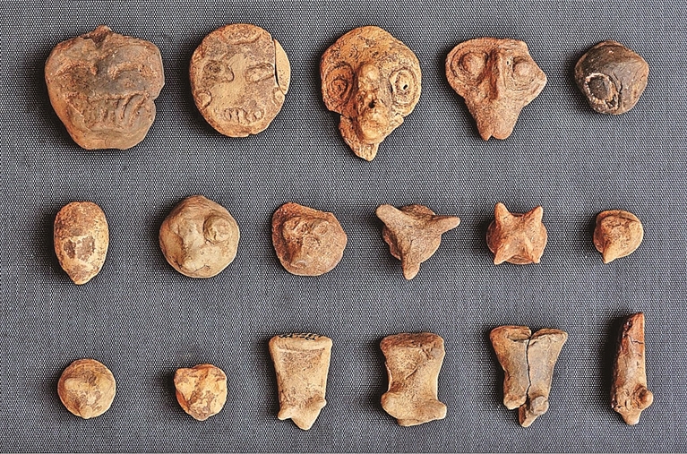 遗址墓葬区出土的最具特色的遗物当属那些神态各异、造型朴拙的人面陶塑。武笑迎介绍,这些陶塑一类具体写实,以动物或者人物头像为主题,制作比较精细,部分表现出了脸谱化、面具化的趋势;另一类制作相对比较简约,形象难辨。其中,还发现了目前最早的人面獠牙形象之一,可能是新石器时代晚期神面形象的源头之一,为研究古人的精神世界提供了重要实物材料。