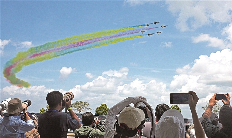 为期6天的第十届新加坡航展2月3日开幕。应邀参展的中国空军八一飞行表演队在开幕式上进行飞行表演,6架歼-10表演机在海天之间上演了一场“空中芭蕾”。这是中国空军八一飞行表演队换装歼-10C后首次公开亮相新加坡。图为2月3日,中国空军八一飞行表演队在第十届新加坡航展首日进行飞行表演。