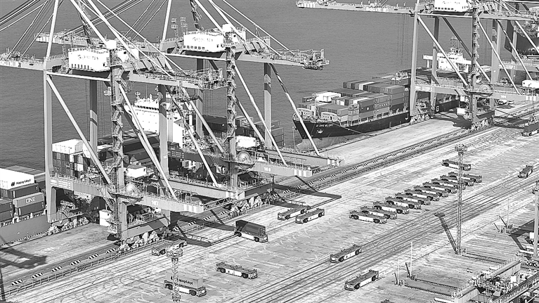 日前,山东港口青岛港外贸航线总数已增至近240条,连接全球180多个国家和地区的700多个港口,进一步巩固了其中国北方港口航线最多、密度最大的国际枢纽港地位,为区域外贸发展及全球供应链畅通提供了坚实保障。图为2月4日,在山东港口青岛港全自动化码头,自动导引车在运送货物。