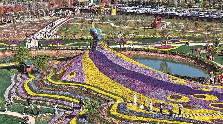 春节前,坐落于昆明市呈贡区斗南滇池湿地公园旁的七彩花海公园2月5日正式对外开放,公园围绕巨型孔雀花雕打造十大特色景观区域,成为滇池沿岸供市民游客赏花休闲的新去处。图为2月6日,游客在昆明七彩花海公园参观游览。