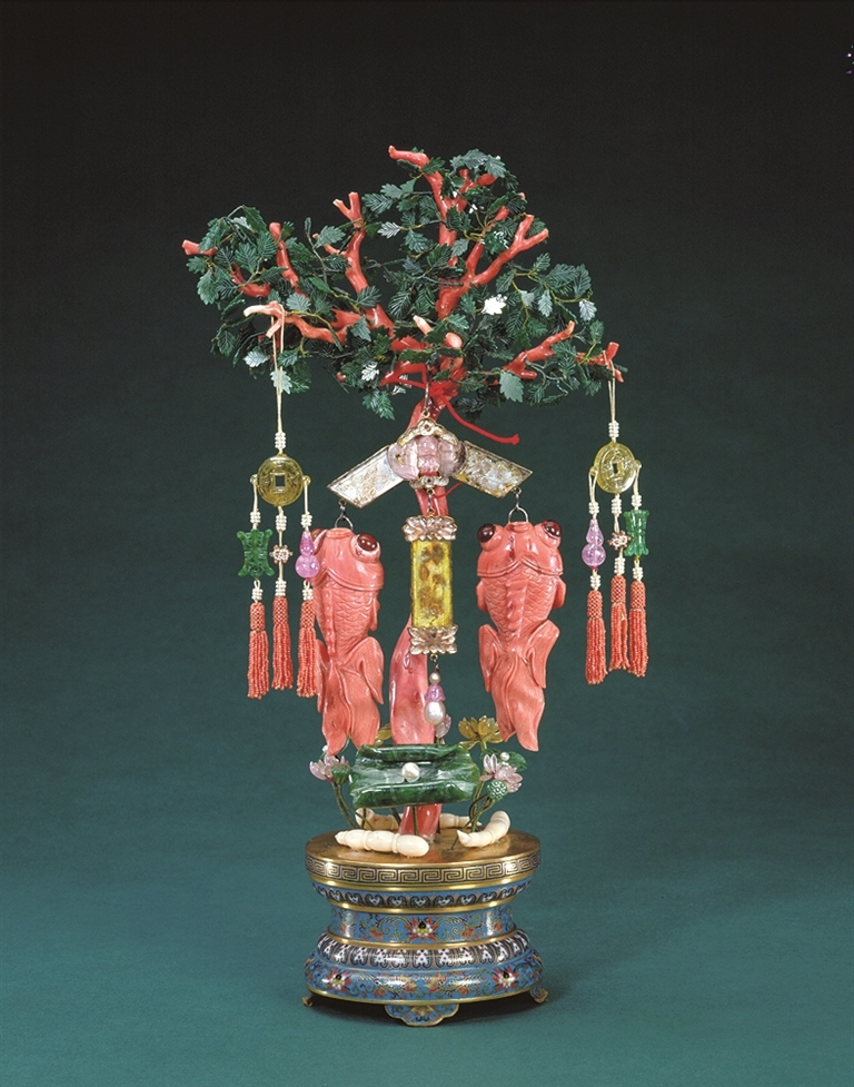 除以植物为主体之外,清宫像生盆景中还有将多种景物组成一组景观的情况。比如掐丝珐琅座珊瑚双鱼盆景,在束腰珐琅座上以珊瑚树为主景,上饰翠叶,悬挂铜镀金嵌水晶磬,正中镶粉色碧玺蝙蝠,口中衔碧玺莲花纹长方牌,牌下连缀珍珠坠。磬两端悬珊瑚金鱼,镶嵌深红色蜜蜡眼睛。两侧树枝上还挂有一对“福寿双全”坠饰,黄碧玺古钱带凸耳,垂挂翠寿字、珍珠盘长、碧玺葫芦和米珠珊瑚穗。树下有镶珠翡翠荷叶,点缀碧玺莲花、翡翠莲蓬和象牙莲藕等。其中莲花、金鱼与磬等意象共同构成“吉庆(磬)有余(鱼)”“连(莲)年有余(鱼)”等吉祥寓意。