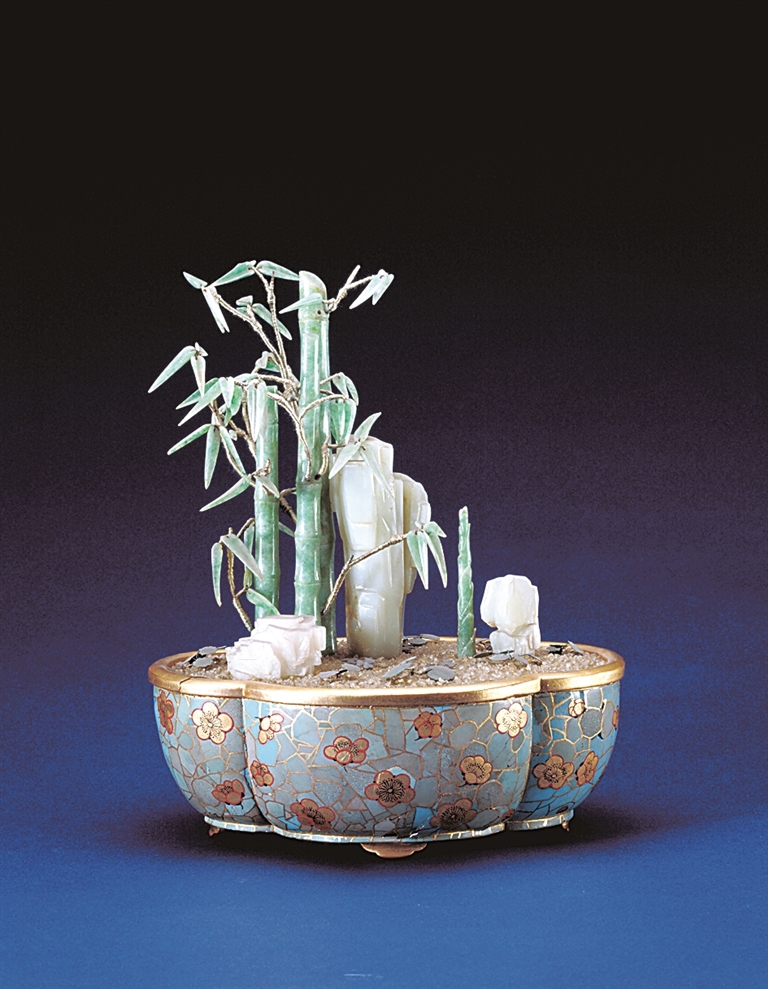 木胎嵌松石盆翠竹盆景,木制花盆四出葵瓣式,下承如意云形足。口、足髹金漆为饰。盆壁的冰裂梅花纹装饰,是以不规则的绿松石片拼贴而成,局部经补色,又以金、红色漆描画冰裂及梅花,极见巧思。景以四块白玉为山石,衬托三杆翠竹及一根翡翠竹笋,又以金属丝缠缚为枝条,上缀翠叶。竹子在传统观念中是平安的象征,称作“竹报平安”,竹与笋又可谐音“祝生孙”。此景景物并不繁复,但善用疏密对比,雅致不俗。加之不同材质间的颜色、质感相互映衬,自然和谐。