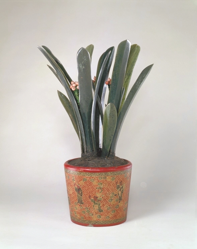 填漆筒式盆玉石万年青盆景,盆木质筒式,通体朱漆,雕刻填金卍字地流云及八仙纹。盆中栽植叶片舒展的碧玉万年青一株,叶间映衬色泽殷红的圆形玻璃果实。万年青是清宫中十分喜爱的装饰题材,有海晏河清、四海清平之意。