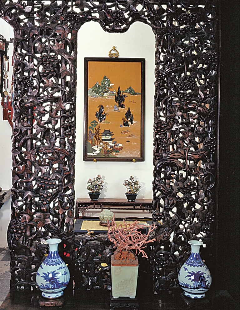 如今故宫博物院开放区域主要是依据紫禁城原状复原,虽然难以做到若合符节,但也可以为我们认识像生盆景的陈设习惯提供一个直观的现场。以储秀宫东次间前沿炕紫檀雕花炕几上的玉盆珊瑚盆景为例,它与一对玉壶春瓶并置,通过镂雕的落地罩,在分割中保留了通透感,从背面看过来还有借景之妙。