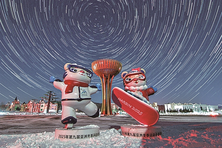 黑龙江省亚布力滑雪旅游度假区位于长白山脉,冬季雪资源存留期长达170天,享有中国“雪之门”的美誉,曾承办过亚冬会、大冬会等国际赛事。图为2月7日在亚布力滑雪旅游度假区拍摄的星空下的第九届亚冬会吉祥物。新华社发