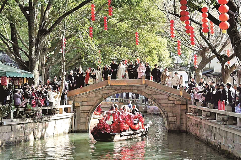 现在,同里古镇已经被喜庆氛围填满了,我们把红灯笼挂满沿河街巷。走三桥婚俗、状元巡游、迎财神、同里宣卷……“骐骥纳福 贺岁同里”的新春活动也会热热闹闹持续整个正月。