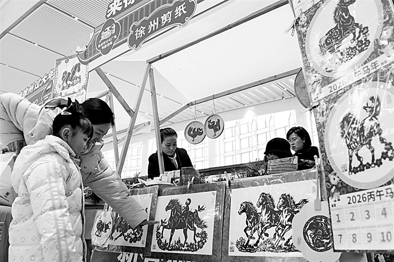 2月10日,在江苏徐州东站,一场“来徐州过大年”活动吸引了不少候车旅客驻足围观。工作人员现场制作、展示香包、剪纸、汉绣等二十余种民俗艺术品,营造浓厚的节日氛围,让旅客体验到浓浓年味儿。新华社记者 毛俊摄