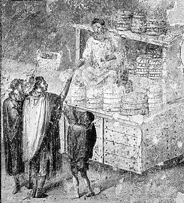 此外,面包和鱼露是庞贝的两大重要食品工业。庞贝城内已知的面包坊有30多处,每个面包坊都基本承担着面包的整个制作流程——碾磨谷物、烤制和销售。制作时,由奴隶或家畜拉动巨大的磨盘进行研磨,面包工人把面粉揉成面团,有时还会在面团被送进烤炉之前印上属于自己的标签,如“×××制作”字样。“朱莉亚·菲利克斯之家”的一处室内墙壁上,有一幅被后人称为“庞贝的最后一餐”的壁画,画中的面包坊主正在市场货摊上售卖面包,这些圆形面包在表面被均匀地切分,与后来出土的碳化面包一致。