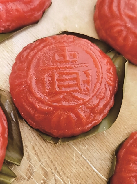 红团主要由馅儿和皮两部分组成,馅是绿豆沙,皮由红色的汁水与糯米粉揉制而成。制作过程是包包子与做月饼的结合体。用面皮包好馅后,放入刻有“福”“寿”等字样的模具中,按压紧实后磕出,一枚造型精美、寓意吉祥的红团生胚便制作完成。还有一个环节看似无关紧要,莆田人却从不肯省略——从当地山上采摘野生鸡蕉叶当屉布,这样不仅出锅时红绿搭配色彩鲜艳,而且蒸熟的红团会带有一股独特的香气。