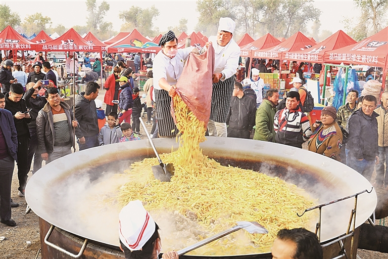 海楼抓饭的根,深深扎在当地生活的肌理中。如今,沙雅的中小学校园里,抓饭制作走进劳动课堂,孩子们在揉米、切菜、翻炒的动手实践中,触摸着传统美食的温度;海楼镇的“石榴籽食堂”里,一碗碗抓饭成为连接邻里、凝聚情谊的纽带;每逢喜事或重要节日,它是招待亲友必不可少的佳肴;胡杨季、丰收节期间,它与民俗、旅游相融,为沙雅文旅发展注入鲜活动力;而到了春节,外地游客来到沙雅,热情的当地人会邀请他们“尝一尝咱的海楼抓饭”,烟火气满满的抓饭店,也成了很多人体验沙雅风情、感受当地年味的好去处……