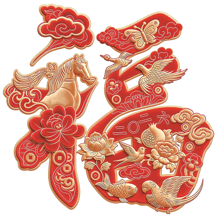 天津美术学院设计了两幅独具津味特色的“福”字作品,将对故乡年味的细腻体察转化为笔下的温情叙事。《津门纳福》巧妙地将天津的城市记忆编织进“福”字的骨架之中。左侧,“福”字的笔画化身为摘桃孩童与翩飞的风筝,唤起观众的童年记忆;一位驻足凝视的小画家,则是城市的观察者与记录者;右侧,作为地标的世纪钟与绽放的月季市花并置,寓意这座永恒绽放的“月季之城”正是传统文化的守护者。作品融合了杨柳青年画饱满的构图与现代插画的流畅线条,色彩在强对比中寻求和谐,使“福”字既承载着吉祥寓意,更成为一幅浓缩了天津历史底蕴与当代活力的文化切片。另一幅《福伴马岁》则以剪纸艺术为基底,将马年生肖与天津泥人张经典的“梦娃”形象创造性融入“福”字架构。左侧,“示”字旁变形为一匹水墨笔意般的奔腾骏马;右侧,“田”部则嵌入憨态可掬的“梦娃”,其衣襟上的海棠花纹样细腻精巧。环绕的鞭炮、灯笼、鲤鱼、牡丹等图案,如同铺开一幅热闹的津门年俗长卷。红黑撞色的色彩搭配,彰显出强烈的现代设计感。