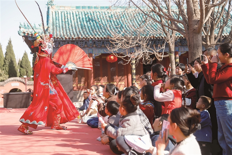 春节期间,各地文旅活动百花齐放,丰富人们的假期生活。图为2月20日,在河南省武陟县嘉应观黄河文化博物馆,工作人员为游客表演变脸。