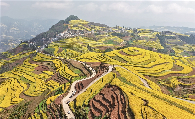早春时节,云南省罗平县漫山遍野的油菜花迎来盛花期,构成了一幅美丽的春日画卷,吸引四方游客前来赏景游玩。图为2月22日拍摄的罗平县马街镇鸭格塘云上花梯油菜花景色。孙文来摄/光明图片