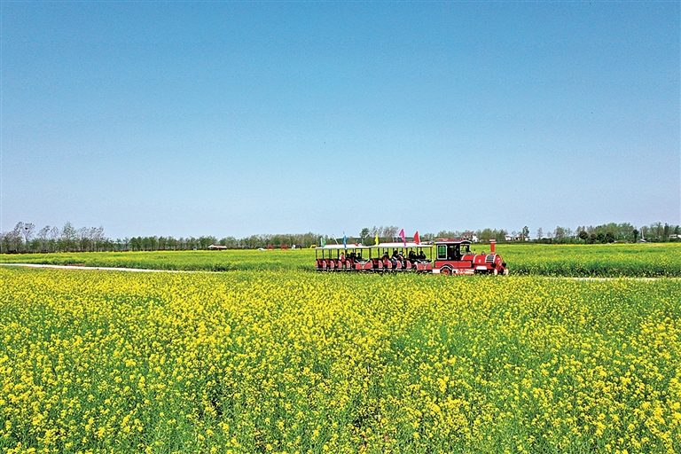 新集村地处豫南平原,没有奇山秀水,也无古迹名胜。于是,新集人便把目光投向脚下的土地。村“两委”以合作社为纽带,规模流转3000余亩土地,打破零散种植的旧模式,先后打造千亩油菜观光带、千亩向日葵与红高粱种植基地、千亩林果采摘园等各具特色的农业景观板块,形成了一季一景。