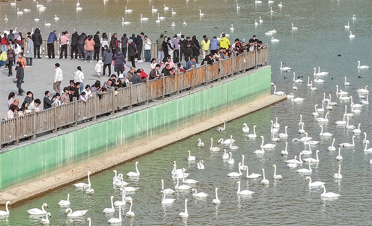 2月22日,山西省运城市平陆县三湾大天鹅景区内游人如织,众多游客欣赏在此栖息的大天鹅。常奇摄/光明图片