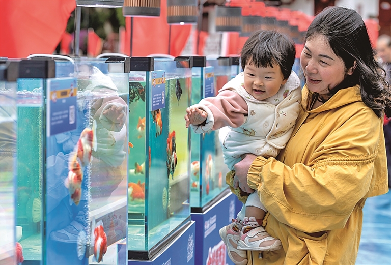 2月25日,2026年“福州金鱼城市移动会客厅”新春三部曲西湖站在福建福州西湖公园晨曦广场启动,超600尾名贵特色品种金鱼亮相展示。图为市民在观赏金鱼。新华社记者 魏培全摄