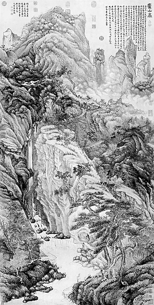 《庐山高图》尺幅巨大,高近两米,宽逾一米,采用的是“纪念碑式”的构图,画中之山雄浑高耸、层峦叠嶂。山中飞瀑直下,有“以涧道开鸿蒙”之姿。前景处,有一高逸之士立于岸边,这应该就是学生对恩师自得其乐于山水之间的摹写。